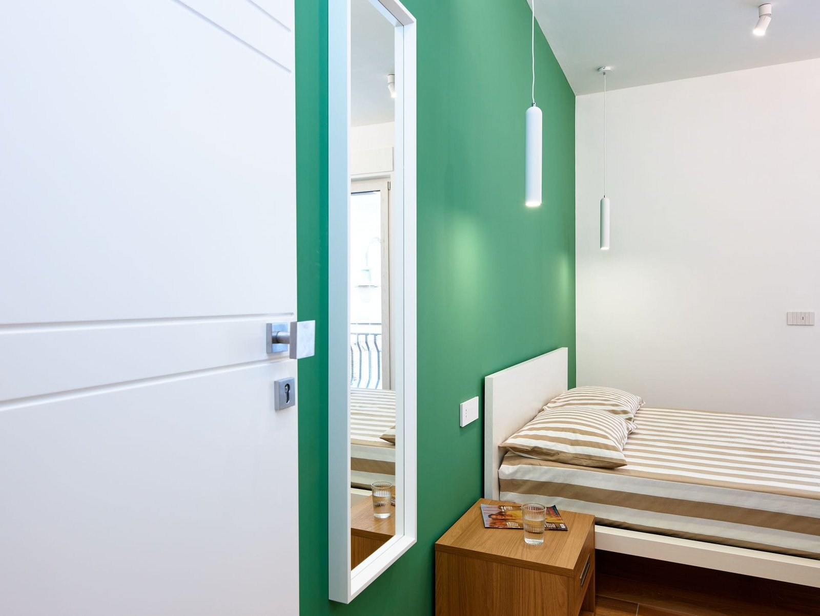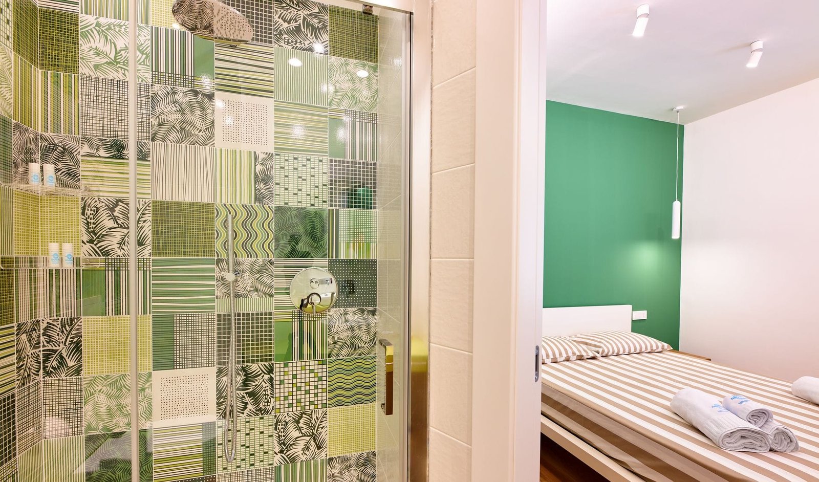 Camera con letto matrimoniale queen size, bagno e terrazzo privato. Negli ambienti predominano i toni del verde e i colori della natura.